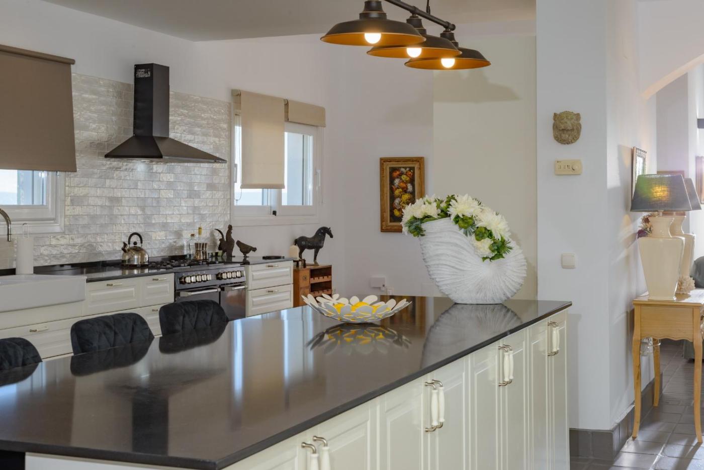 La villa cuenta con 4 dormitorios, 4 baños, ropa de cama, toallas, TV con canales vía satélite, cocina totalmente equipada y terraza con vistas a la montaña.