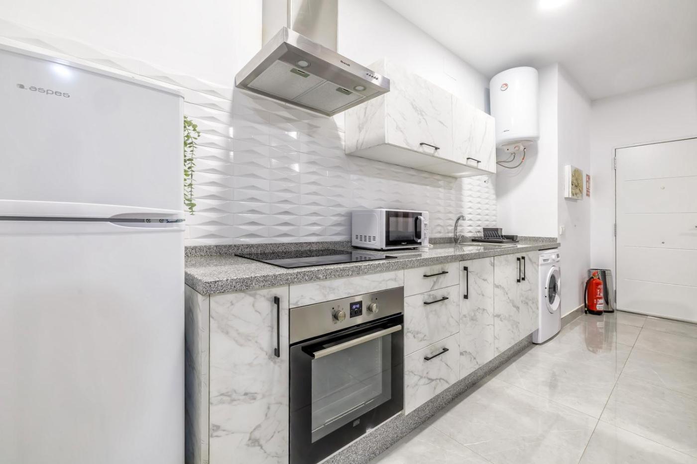 Apartamento - Planta baja. Boasting a private entrance, this air-conditioned apartment comes with a kitchen, 1 bedroom and 1 bathroom with a walk-in shower and a hairdryer. The well-fitted kitchen features a stovetop, a refrigerator, kitchenware and an oven. The apartment has tiled floors, a seating area with a flat-screen TV with satellite channels, a washing machine, soundproof walls, as well as a coffee machine. The unit has 1 bed.