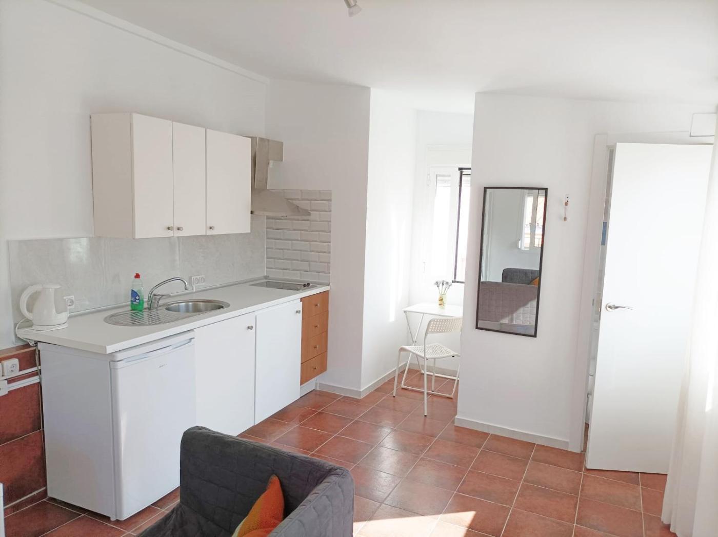Estudio con terraza. The well-fitted kitchen features a stovetop, a refrigerator, kitchenware and a microwave. The studio offers air conditioning, a washing machine, a terrace with city views as well as a private bathroom featuring a shower. The unit offers 1 bed.
