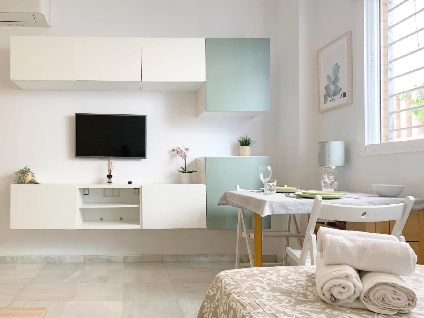 Estudio Doble Deluxe. In the kitchen, guests will find a refrigerator, kitchenware, a microwave and a toaster. This air-conditioned studio has a private bathroom, a washing machine, a tea and coffee maker as well as a terrace. The unit has 2 beds.