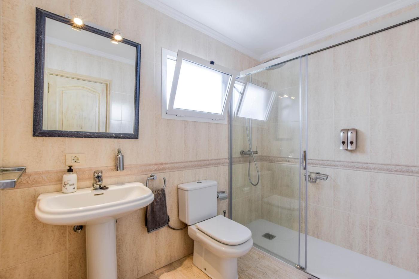 El apartamento tiene 2 dormitorios, una cocina con nevera y horno, y 3 baños con ducha, secador de pelo y lavadora. Hay toallas y ropa de cama en el apartamento.