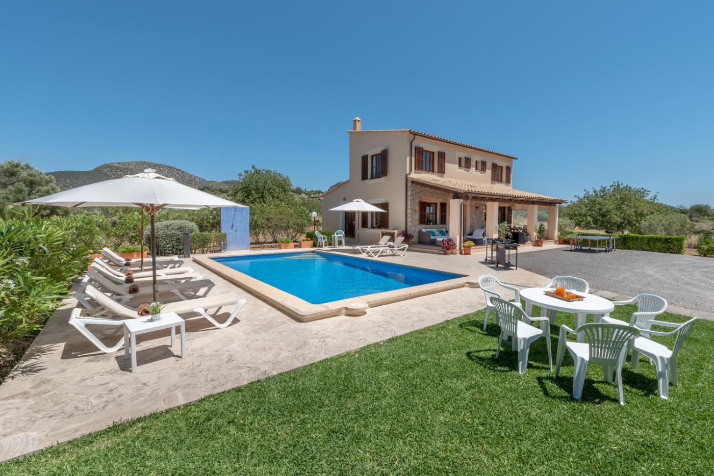 La villa dispone de 4 dormitorios, 3 baños, ropa de cama, toallas, TV con canales vía satélite, cocina totalmente equipada y terraza con vistas a la montaña.